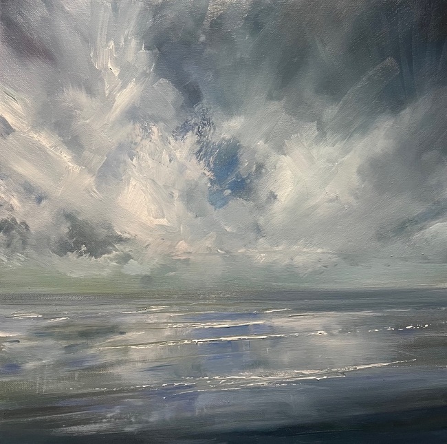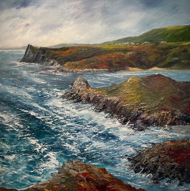 “I can sit for hours, just listening and watching the waves churning in a wind-blown frenzy. I strive to paint the noise and communicate the drama of the powerful presence of unstoppable, grabbing water cascading inland with pounding fury. Equally, I love the time spent walking across the mountains of Bannau Brycheiniog, where the changing light of ethereal skies over wind-swept moorland provides inspiration for much of my recent work.”