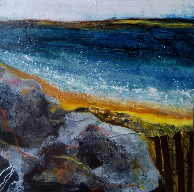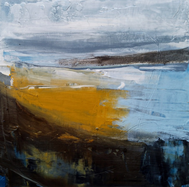 My work is very intuitive at the start, a playful exploration of marks, colours etc until I find something that I can work with which brings with it the cumulative experiences of walking the landscape in which I live, favourite places, life and whatever is going on for me at the time. The foundation of this approach is mark making, very loose and flowing.