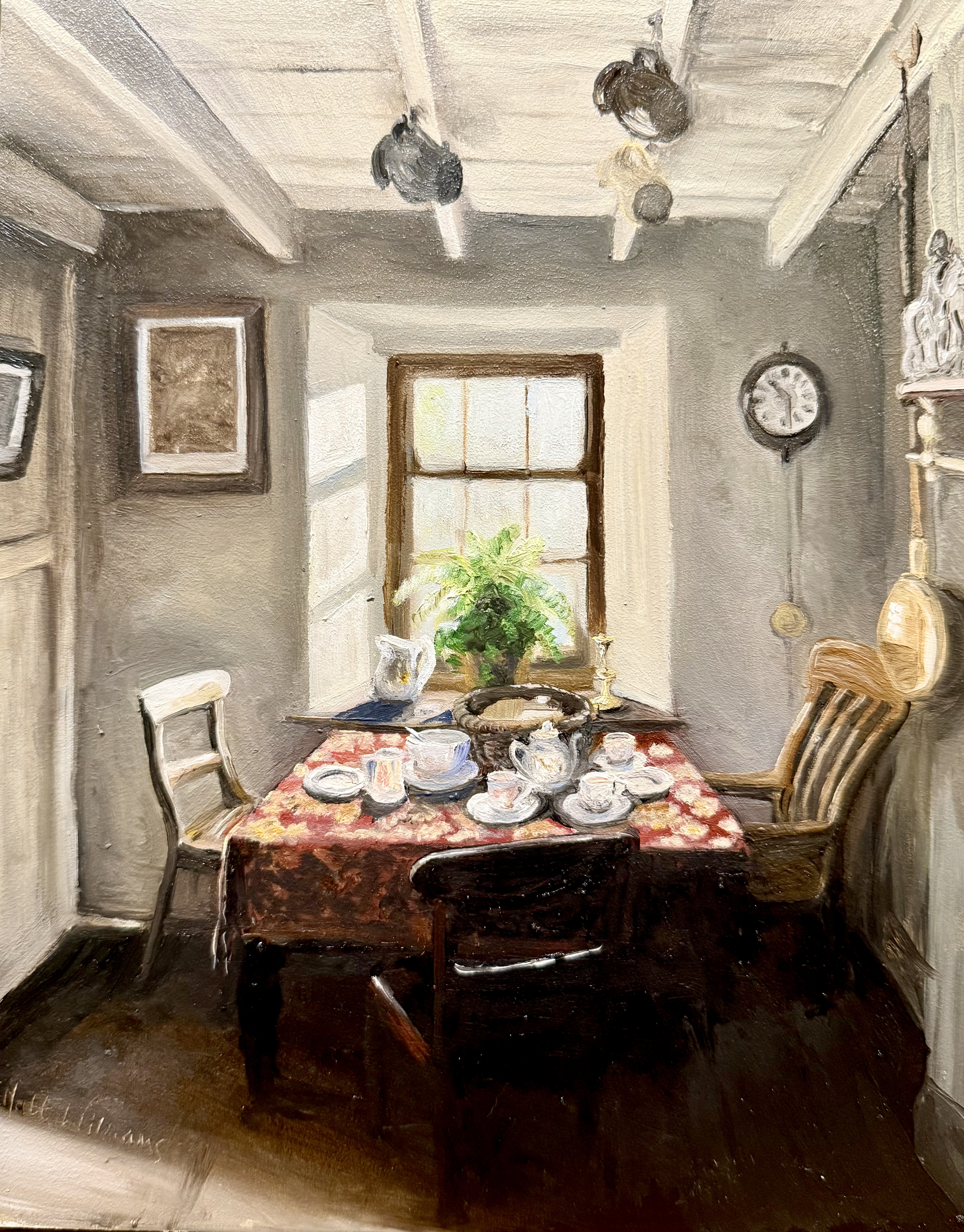 Andrew studied under Patricia Briggs at Swansea College of Art and was later mentored by Gordon Stuart, known for his portraits of Dylan Thomas and evocative Welsh landscapes. His own work reflects a similar depth, often inviting viewers into quiet, timeless interiors where memory and presence softly collide.