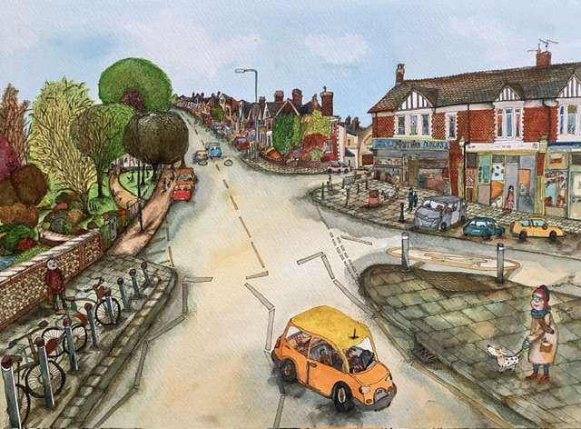 Born in Cardiff in 1967, Adrian Green graduated from Cardiff Art College where he specialised in printmaking. On leaving Art College in 1989 he chose a career outside the Art scene. Adrian’s enthusiasm for painting and drawing was re-ignited during a career break as a project manager on a Raleigh International expedition to Ghana in 1999. On returning from the expedition he began painting regularly, with vibrant works of African street scenes and aerial views in pen/ink and watercolour. He was awarded the people’s favourite artist at the Welsh Artist of the Year Award in 2001 and was highly commended in the same competition in 2002. Adrian has exhibited in a number of galleries across the UK. His works include local street scenes and British and International city interpretations which are well known for being intricate, colourful and deceptively child-like.